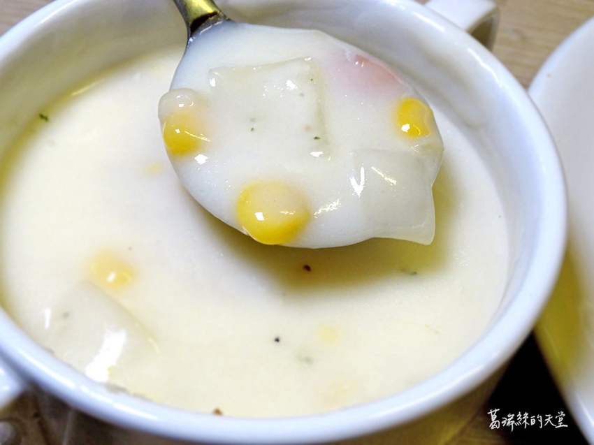 濃湯超有料,有玉米粒、熱狗丁以及入口即化的洋蔥片,