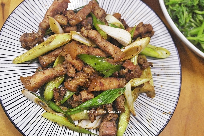 油亮的爆炒蒜苗鹹豬肉味道出乎我意料之外的好吃,