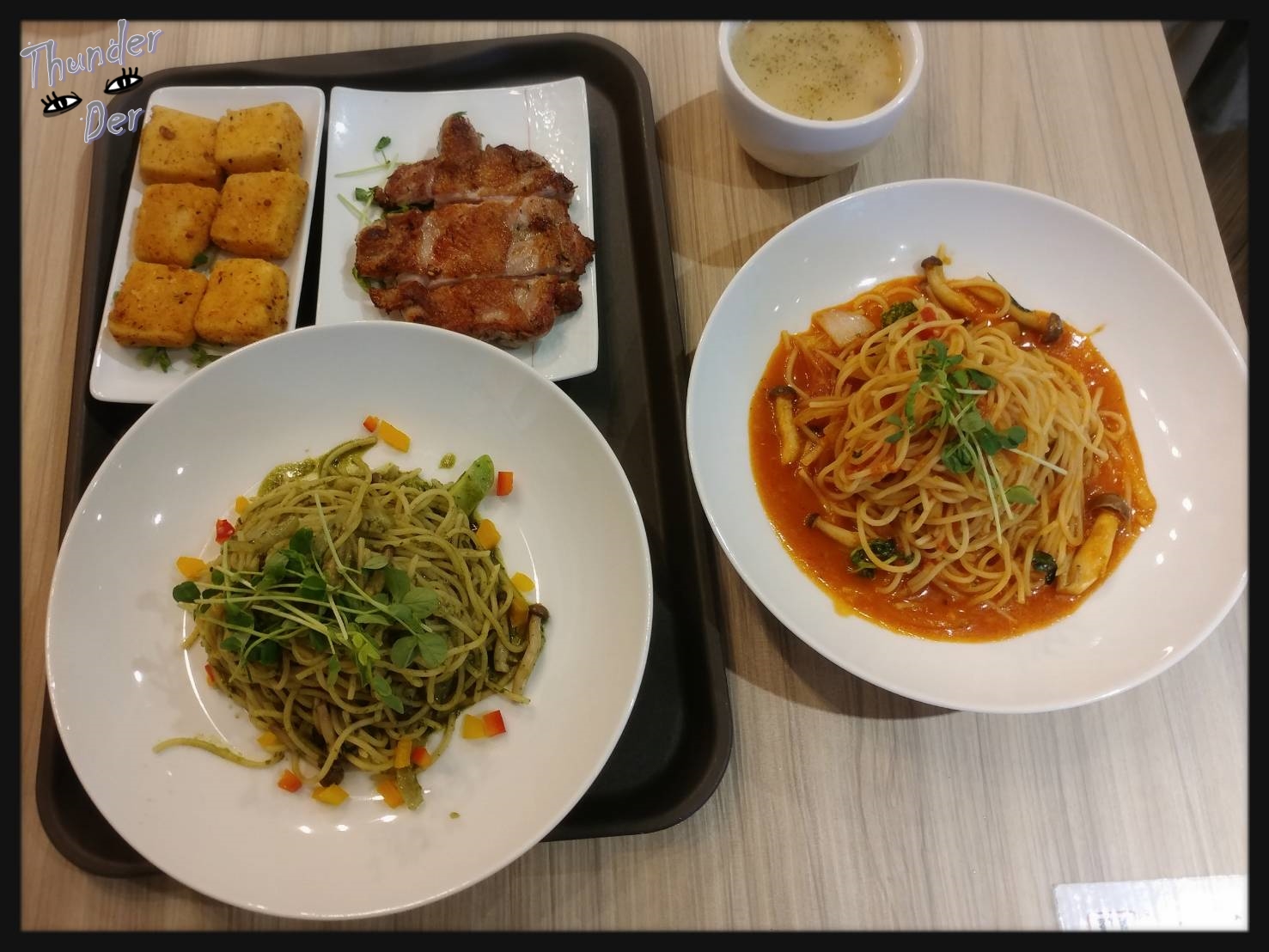 下圖是原味時蔬義大利麵(青醬)加自由配的迷迭香煎雞腿共180元