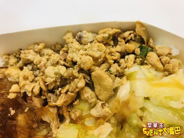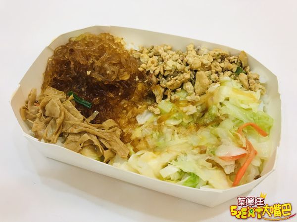 ▼搭配的配菜都是固定的,醬油蔥花炒蛋、塔香紅燒豆皮、蒜香高麗菜、螞蟻上樹。從早期開賣吃到現在記憶中這幾樣配菜都沒有換過。