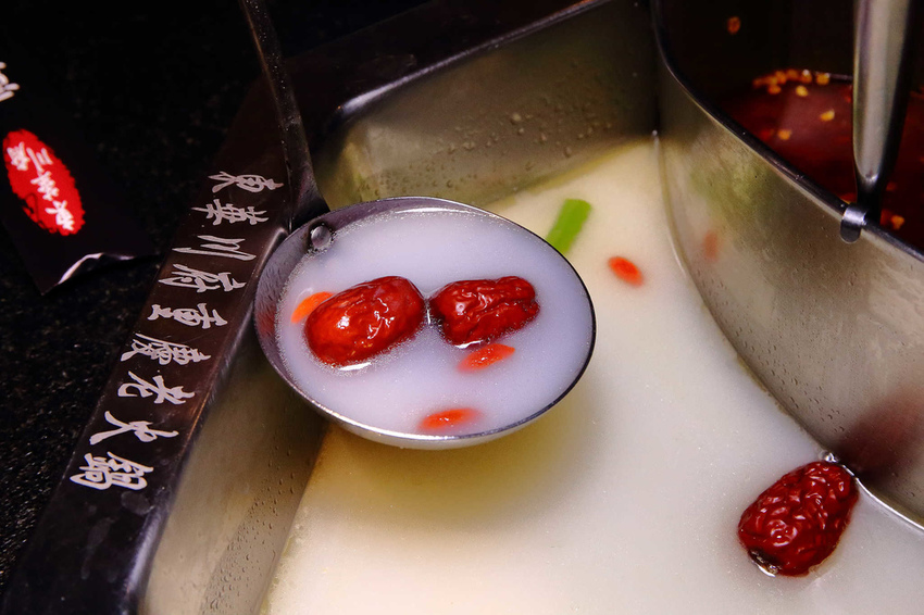 白湯鍋底,用多種新鮮大骨以及12種中藥材熬製,是帶有濃稠度的白湯,