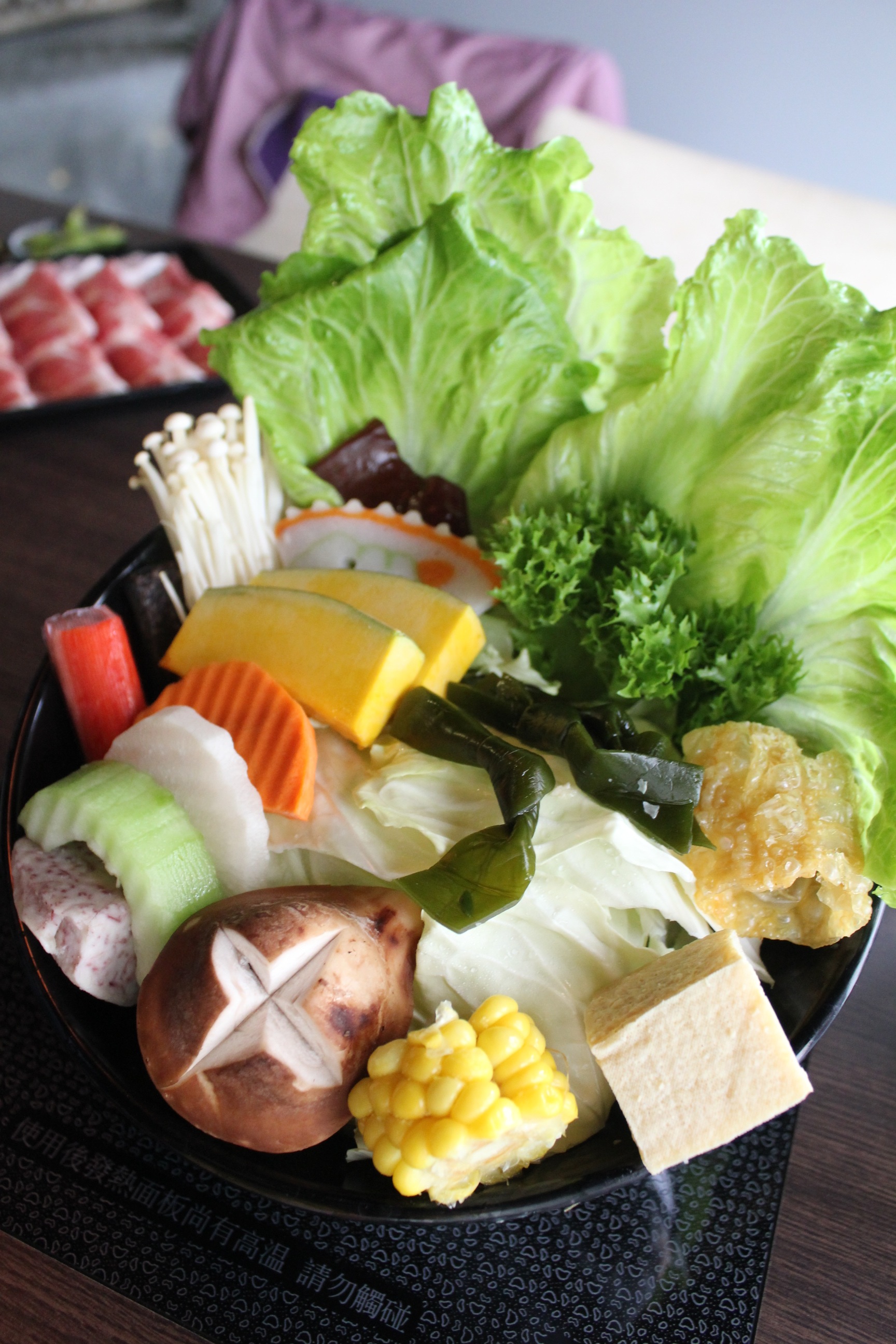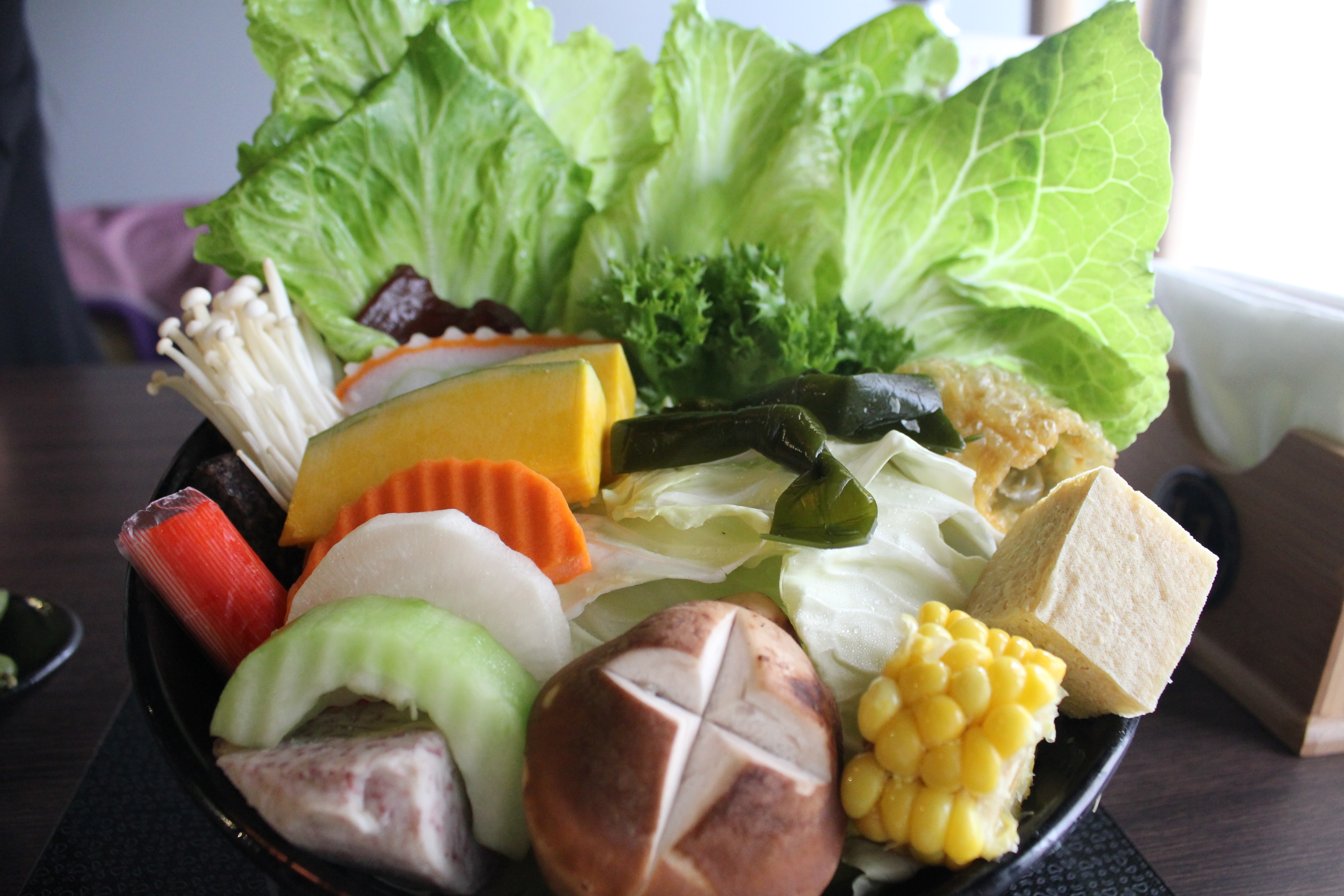 主餐今天上著的是豬肉與鮭魚(石狩鍋)。梅花豬分佈的油花好漂亮,嚐起來的口感也非常棒!