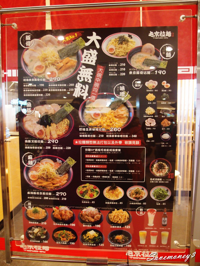 屯京拉麵門口就有菜單,拉麵$190起,加$65或$95可升級成不同套餐