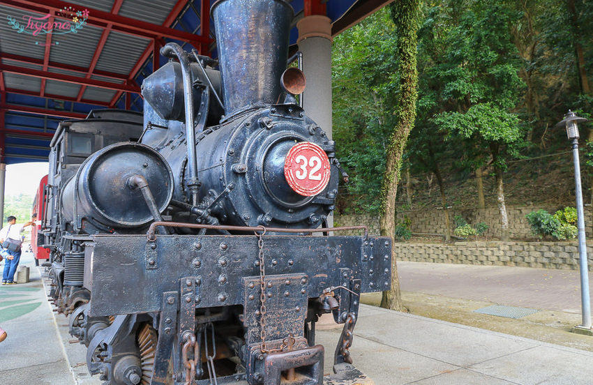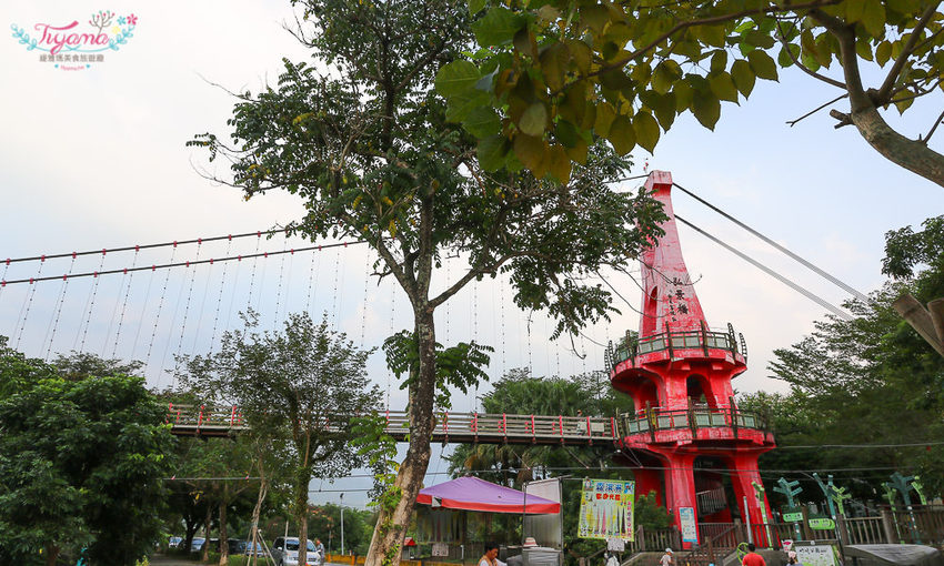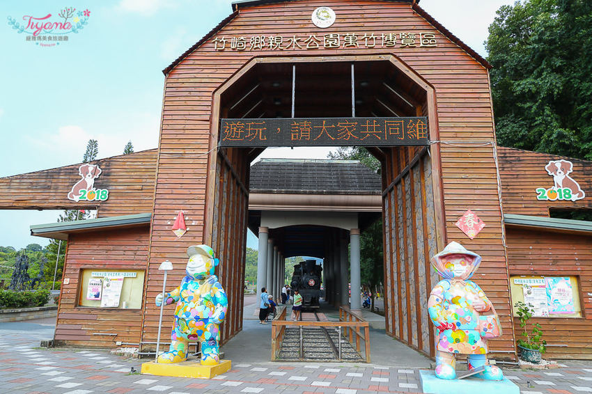 我們從竹崎親水公園大門入口進來,車可以停到對面巷子進去不遠的停車場(有指示牌),先和二十八噸火車頭合照,再到左邊的行千吊橋(千禧橋)拍張網美照