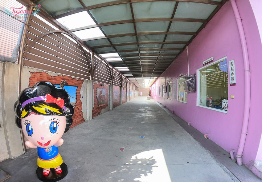 卡普秀是由真正工廠轉型的觀光工廠 ,從導覽入口進去,先看到可愛的膠囊女孩公仔,左邊是世界各國知名景點彩繪牆,右邊是製程參觀區