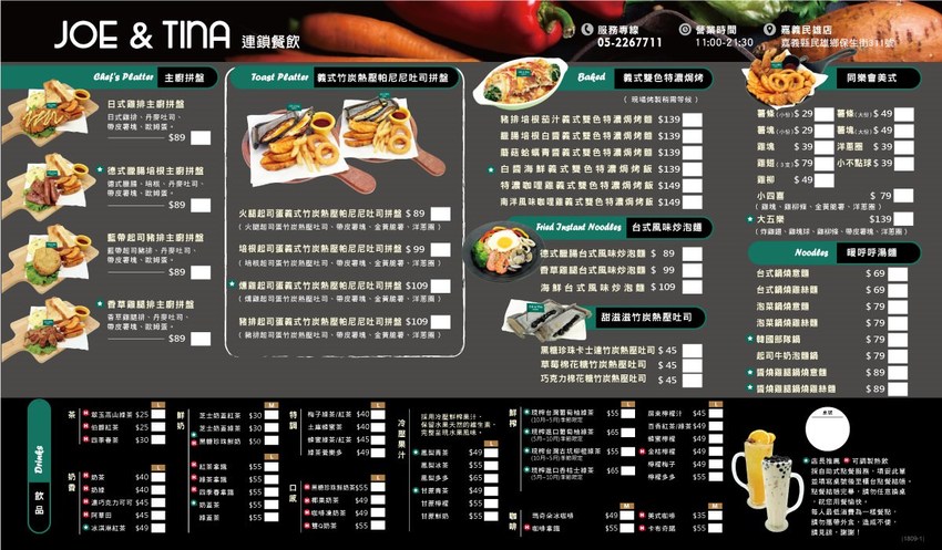 “主廚拼盤”和”義式竹炭熱壓帕尼尼吐司拼盤”89元起,台式風味炒泡麵、暖呼呼湯麵也只要$69元起,想吃大份量就可以吃”義式雙色特濃焗烤”價格也很親民,茶飲、鮮果飲、鮮奶茶、咖啡的消費都是一般茶飲店的外帶價唷!