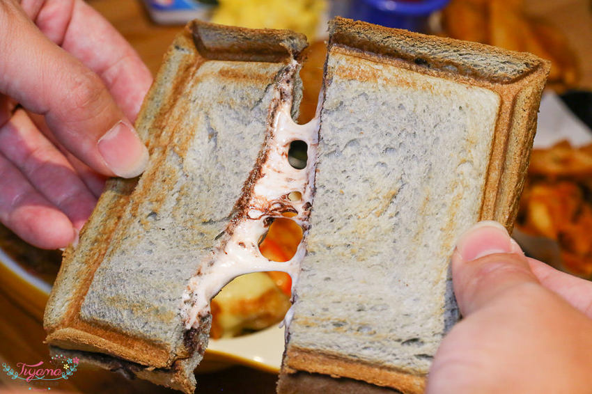 巧克力醬和棉花糖的不敗組合,搭配紮實小有嚼勁的養生竹炭吐司,口感更佳