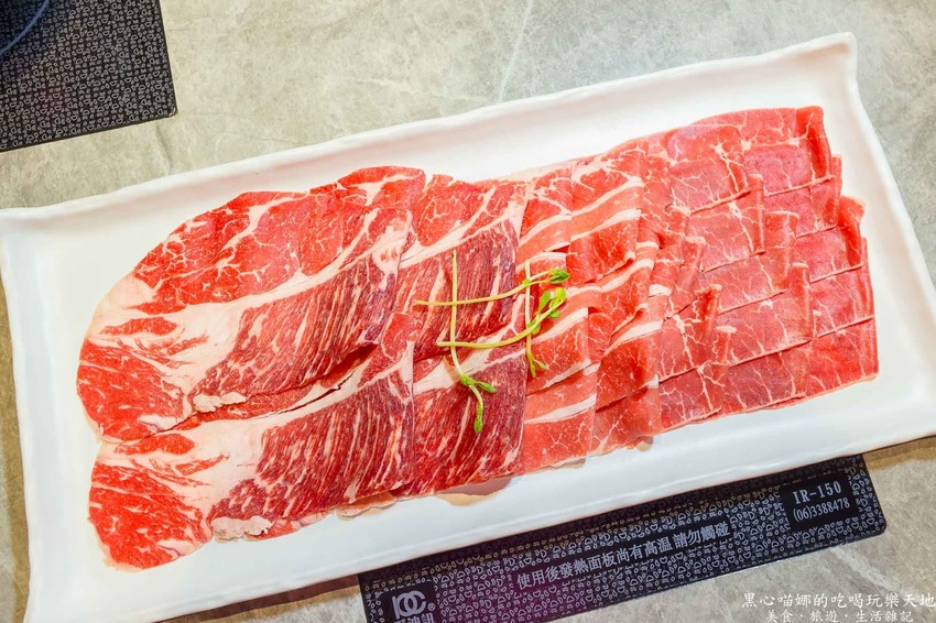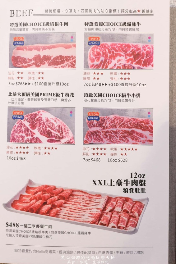 總共有三種不同部位的肉,由左至右分別為比臉大頂級美國PRIME級牛梅花、特選美國CHOICE級培根牛肉、特選美國CHOICE級霜降牛。