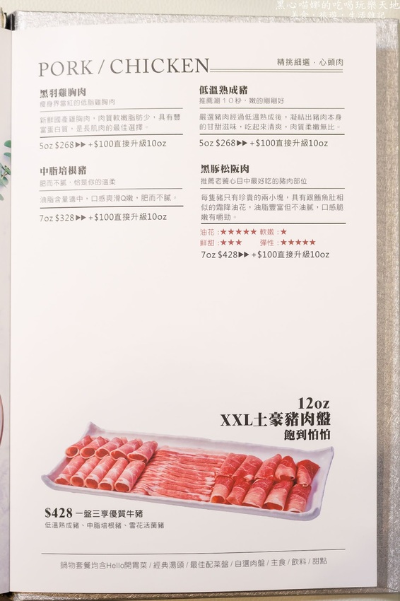 一樣有三種不同部位肉品可以吃,由左至右分別為低溫熟成豬、中脂培根豬、雪花活菌豬。