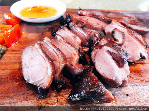 櫻桃鴨本身肉質較嫩,經過窯烤後,肉質有彈性,沾上獨家的蜜柑橘果醬,超搭的