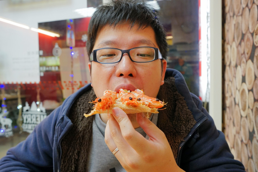 這款海大俠披薩原本上面只有八隻海蘆蝦,老闆現在可以客製化成兩倍、甚至三倍份量的煙火俠披薩,24隻海蘆蝦把整個披薩都蓋過去了,不說的話誰還認得出來這是披薩呢XDDD.