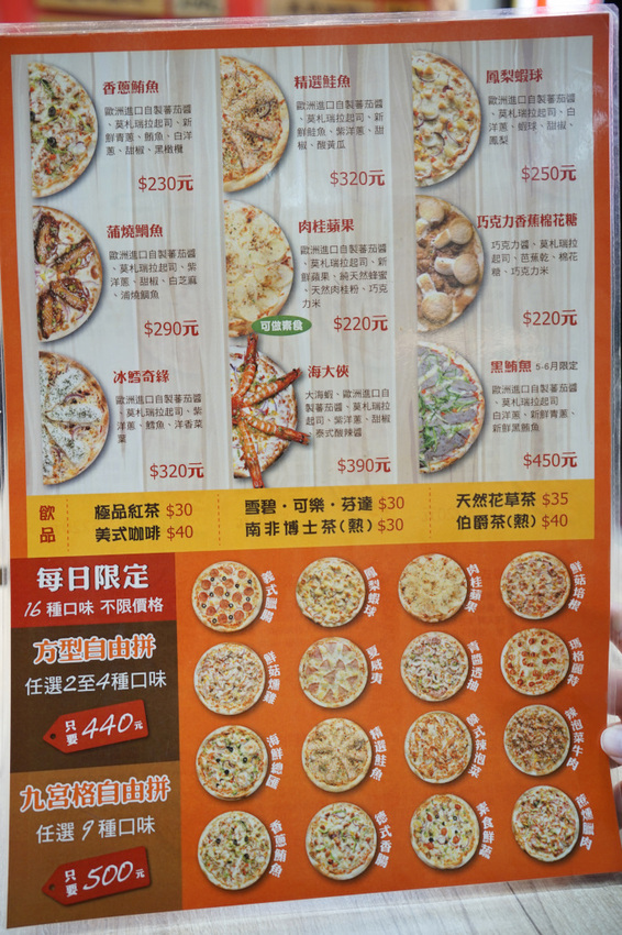 愛披薩推出的方形披薩一直很受歡迎,可以任選2~4種甚至到9種變成九宮格的概念,一次可以吃到九種口味實在是很威XD.不過因為費工費時,所以每天都是限量供應,建議事先電話預訂,現場才要點通常很難有。