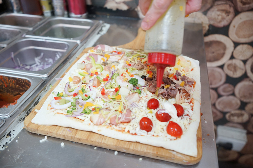 最後我選了青醬透抽、德式香腸、辣泡菜牛肉、鳳梨蝦球、鮮菇培根、海鮮總匯、瑪格麗特、蔗燻臘肉、香蔥鮪魚,九種口味一次滿足,每一種口味的披薩上頭料都滿滿滿,特色鮮明,肉眼就分辨得出口味。