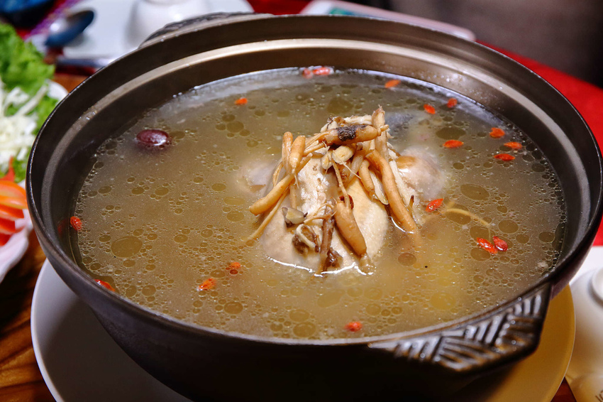 是使用是一整隻土雞下去燉煮的,雞湯喝起帶著雞肉的鮮甜又有著人參的香氣,真的是有夠鮮甜的!