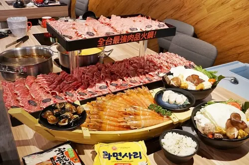 肉品都是選擇完後廚房現切,所以鍋底、菜盤來後,就是最主要的肉品及海鮮了。我們選了頂級牛小排大魔神 25 Oz(雙人餐,NTD$2580)、深海蝦魔王(單人餐,NTD$1088),看單價也許會覺得很高貴,不過等等介紹一下包含的內容物,你就會發現物有所值,重點是可以吃的又飽又爽喔!