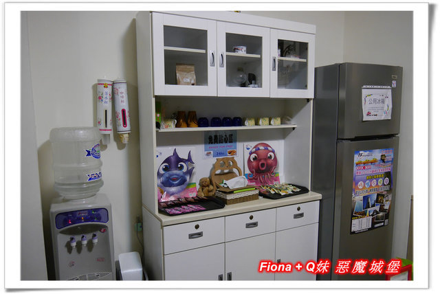 客廳的周邊都是屬於自由使用的空間,規劃有餐桌椅、冰箱與飲水機,櫃子上有糕餅、茶跟咖啡,還有東港相關的旅遊資訊,都是可以自行取用的,有多個家庭一起來住的時候,這裡就可以讓大家聚在一起吃喝聊天囉 !