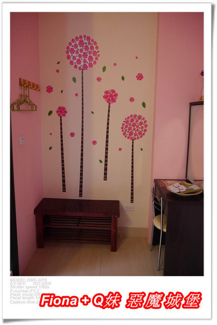 角落設置有鞋櫃、化妝台與掛衣架,這裡的繡球花彩繪好繽紛,我好喜歡啊 !