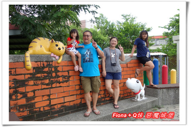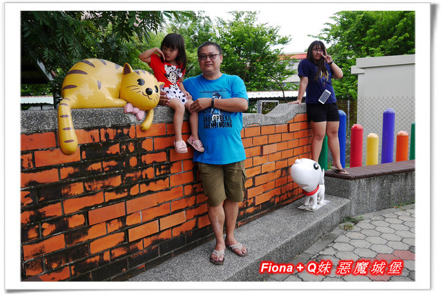 趴在牆上慵懶的貓咪與牆角下親人的小狗,深得姊妹倆的心,好可愛 !