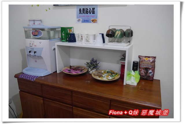 旁邊還有一小區塊的公共空間,這裡也有飲水機、糕餅、茶跟咖啡,對面擺了一張沙發,上頭有可愛的大熊寶寶,Q妹好喜歡它 !