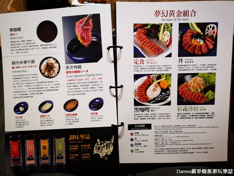 虎次菜單首先介紹店內食材,從主餐、副食到調味沾醬都很講究,菜單品項內容很豐富,先選自己想吃肉品