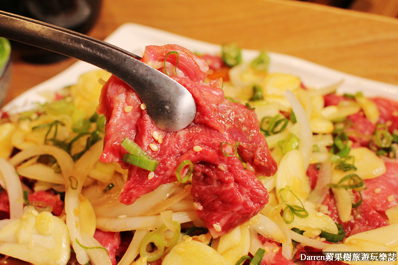 主廚特製秘醬醃漬,選用半筋半肉的牛肉,加上蒜香洋蔥調味,炙煎過的燒肉鮮甜又帶點嚼勁口感層次豐富