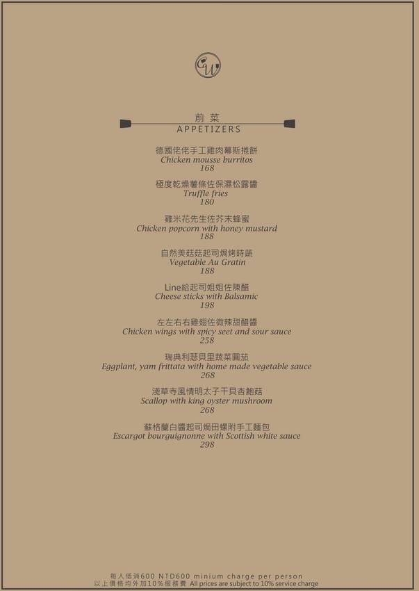 以下是的餐點菜單,供應的餐點為前菜、沙拉、湯、義大利麵、燉飯、主菜(排餐、海鮮)、宵夜及甜點,供應的品項十分多元。