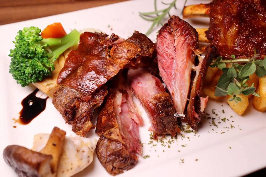 由其餐名就可知道這道料理的主角是豬腳及豬肋排。一旁飾以時蔬、洋蔥圈及薯條。