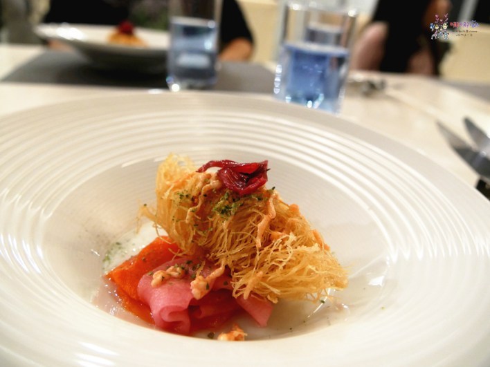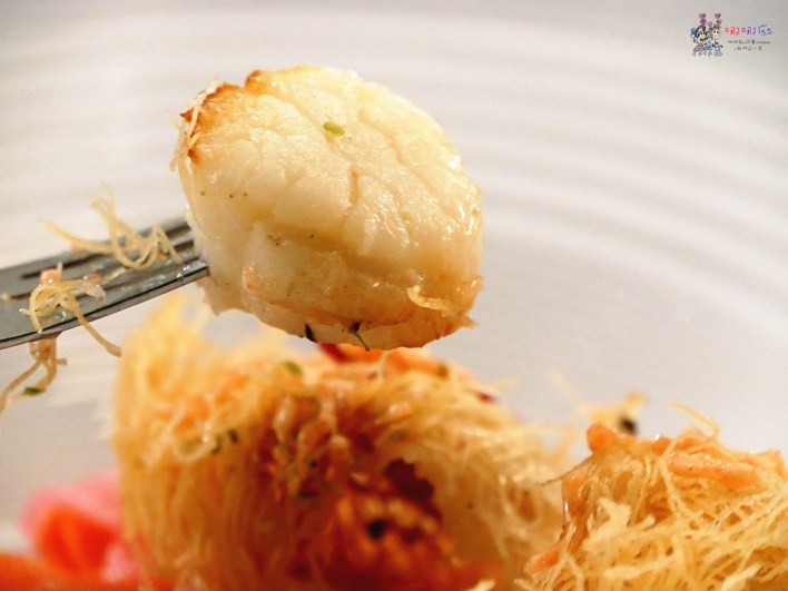 果然是法式料理,菜名長到念完就要斷氣的程度。其實就炸過的米粉包著大干貝,外層香香脆脆,裡面則是新鮮多汁的干貝,梅汁醃漬過的蘿蔔還蠻好吃的,酸酸甜甜的,當作前菜很開胃。