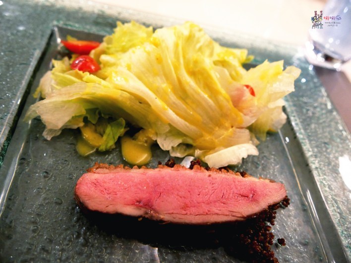 本來我就蠻喜歡吃鴨胸的,他們的鴨胸很柔軟咬下去還吃的到肉汁,不過皮的部分就還好,如果只吃這一塊倒還好,但加上先前的豬梅肉對我來說就感覺肉蠻多的,就丟給阿寶吃囉!旁邊的生菜搭上百香果醬,難得的我竟然把生菜吃完了。
