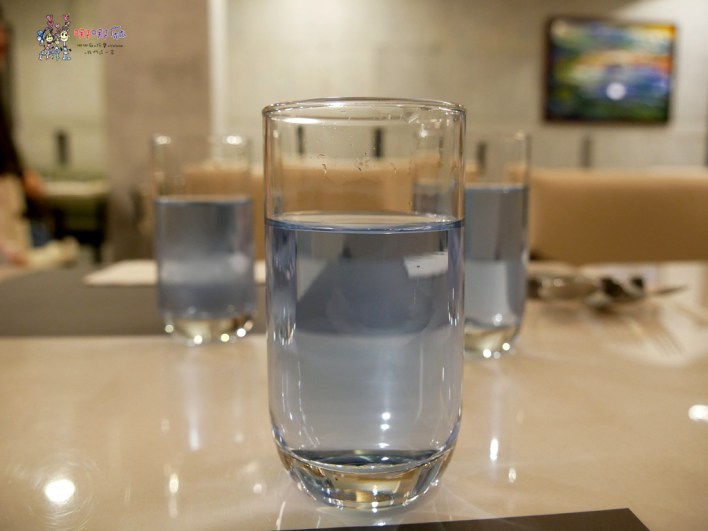 今天我們的餐是兩個大人的餐和一份兒童餐,管家先幫我們上蝶豆花和甘菊泡的水,過一會兒第一道菜就上桌了。