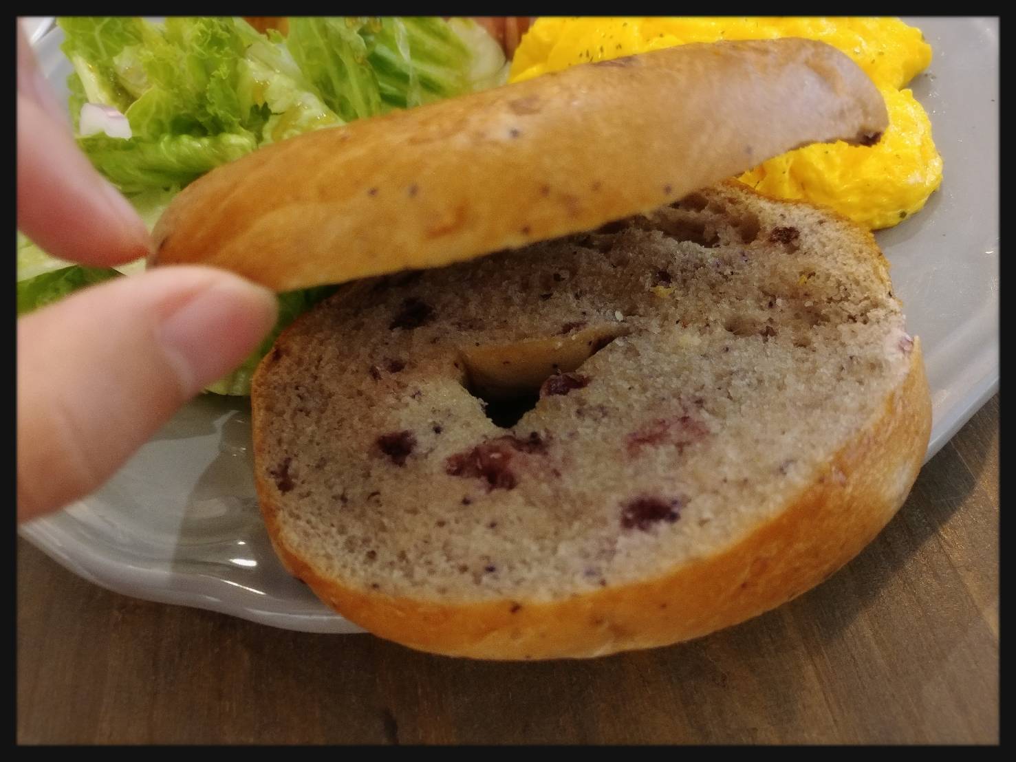 上桌後才發現原來藍莓早就藏在麵粉裡一起製作成藍莓貝果了😂