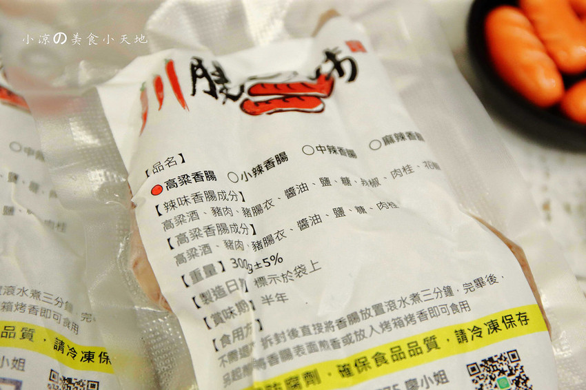 小凉收到兩個禮盒,裡面共有四種口味的香腸,分別是麻辣、中辣、小辣、高梁