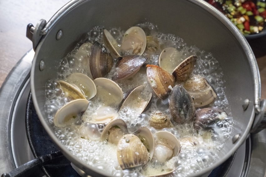 蛤蠣上桌後,店家上桌後先用蒜香去爆香過