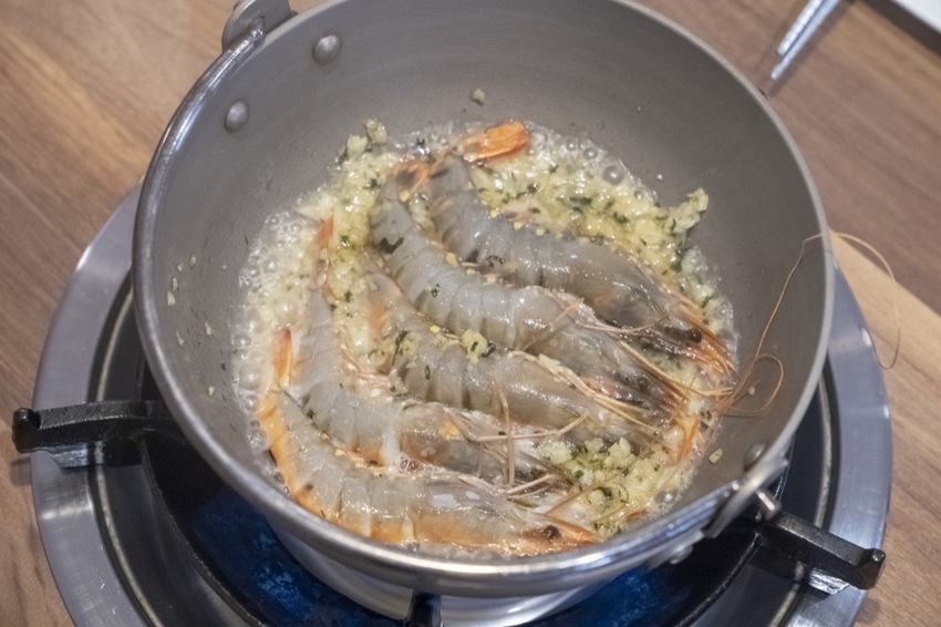 吸取蒜香後的草蝦肉質本身就很Q彈