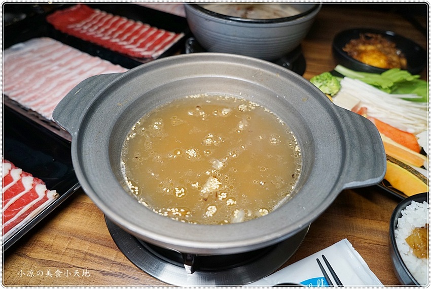 石頭鍋湯頭,有著柴魚片、芝麻的提香,將菜盤放入滾煮、湯頭喝起來更是香醇甜!