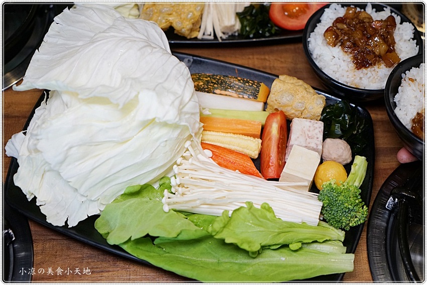 今日的菜盤有高麗菜、根莖類、菇類、茼窩、少許火鍋料,幾乎都是以時蔬為主相當的健康~