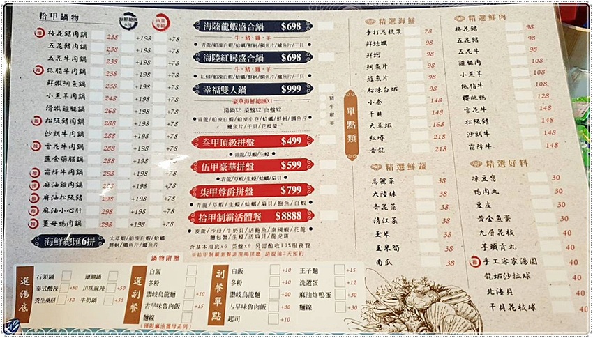 拾甲鍋物菜單,會覺得與一般小火鍋沒啥不同,但在菜單紅框部分你就會發現