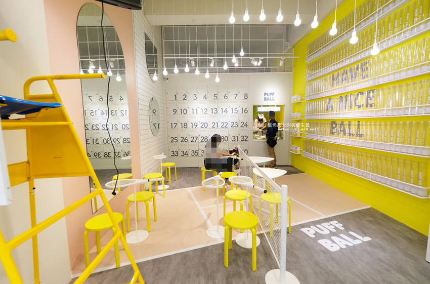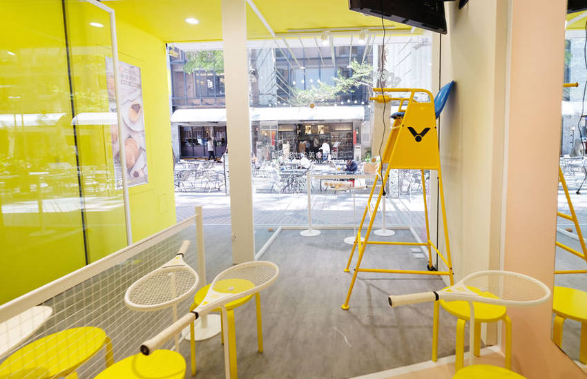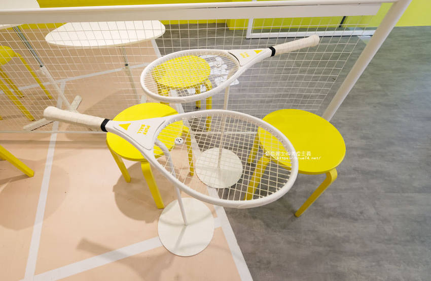 精明商圈出現亮眼黃白色系迷你網球場,網球拍變身桌子