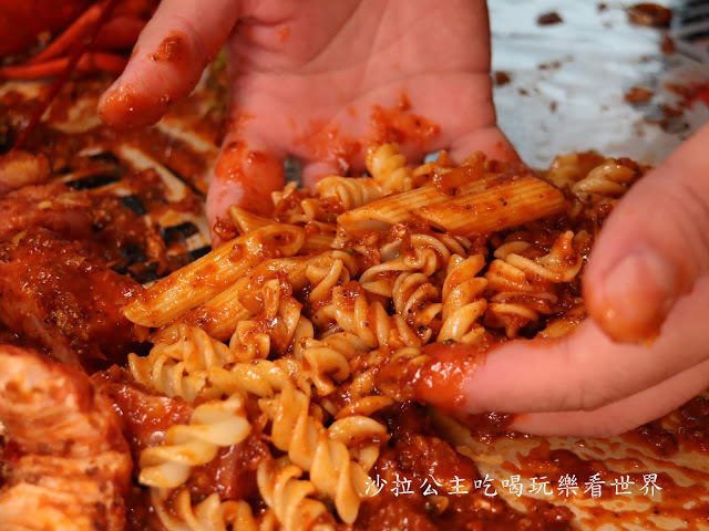 蟹舞招牌醬以番茄、洋蔥為基底,加入肯瓊辛香料,再加上魚露與泰國辣醬提味,醬汁熬煮時間長達2.5小時,不稠也不稀剛剛好,醬汁完全吸附在海鮮上,義大利麵也可以拌進去,好夠味喔