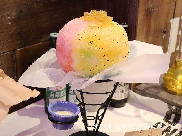 超大圓球三色冰,以百香果、草莓等果汁為主要風味