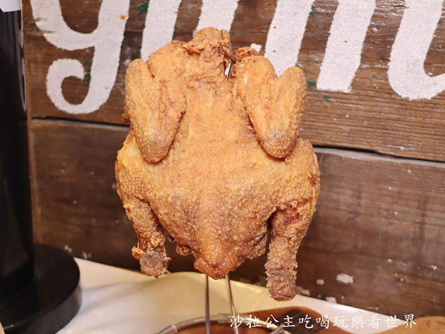 嚴選台東鹿野黑金鑽雞隻,平均約900g,肉質鮮嫩的雞隻,主廚使用月桂葉、黑胡椒、墨西哥香料等醃料,醃製5個半小時,沾裹肯瓊粉酥炸,鮮嫩多汁