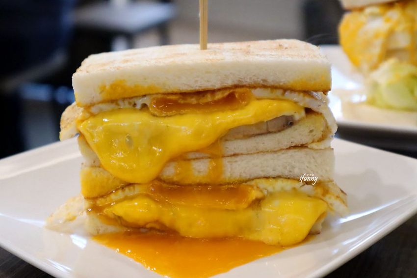 所謂的雙重奏就是加入了兩種的起司,看見那起司融化從吐司之中冒出來的模樣,加上紅心蛋半熟的蛋液流洩下來,實在太誘人了啦!
