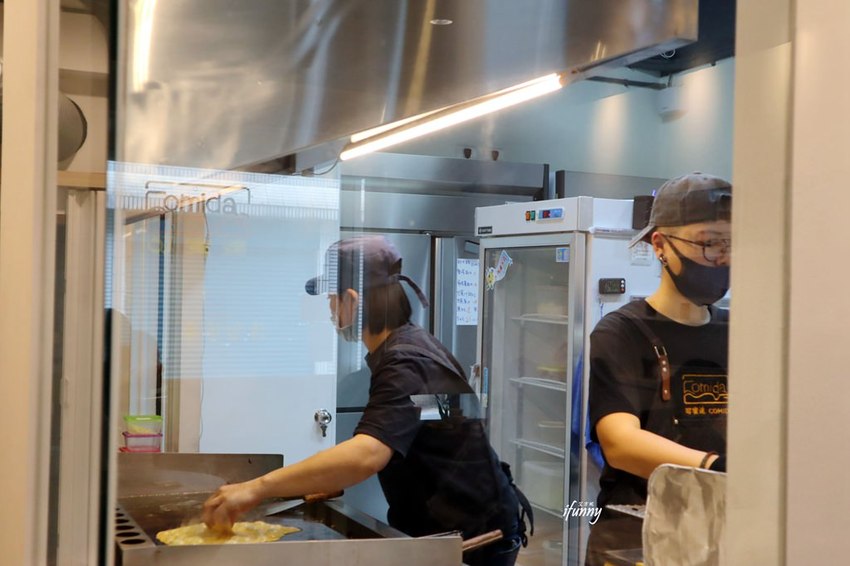 利用玻璃窗大方地展示開放式廚房,工作人員都戴帽子及口罩。其中一個煎檯負責煎肉品及蛋。