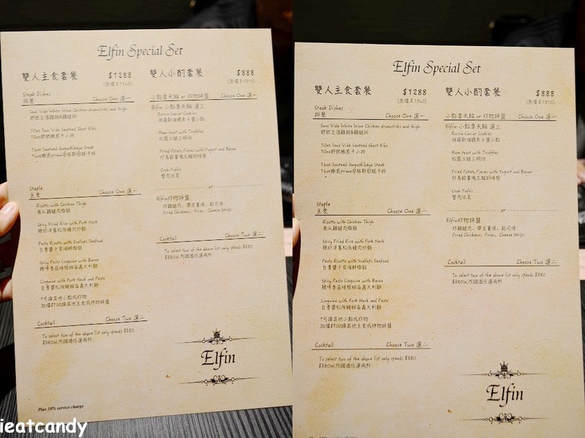 Elfin Restaurant & Lounge菜單(餐點、酒品) :有多樣性調酒、酒品可供選擇,還有義式料理、套餐品嘗,如果只是想享受小酌時刻,也能點品酒小點,價格不會很貴。