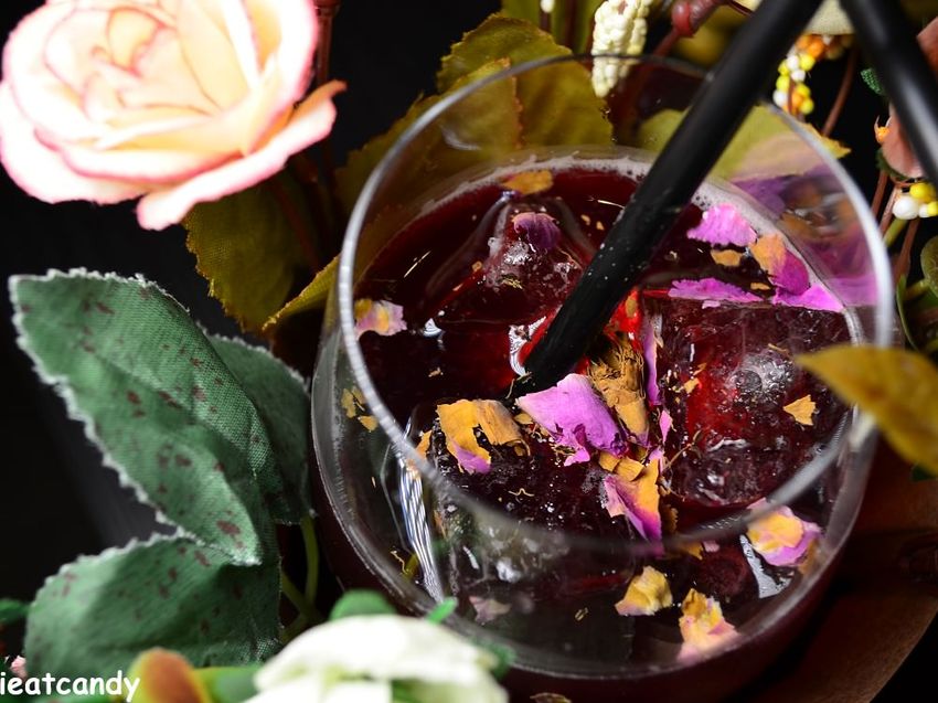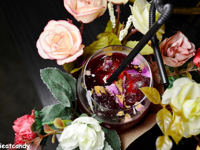 這一杯傑克玫瑰被一束玫瑰花圍繞,調酒上撒著乾燥玫瑰花增添香氣,以紅酒、覆盆子利口酒為基底調製而成,酒味相對明顯一點,但濃度並不高,酸酸甜甜,冰涼著喝很好入喉,女生會喜歡的一杯調酒。
