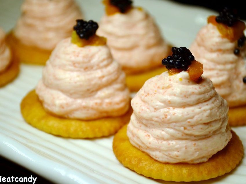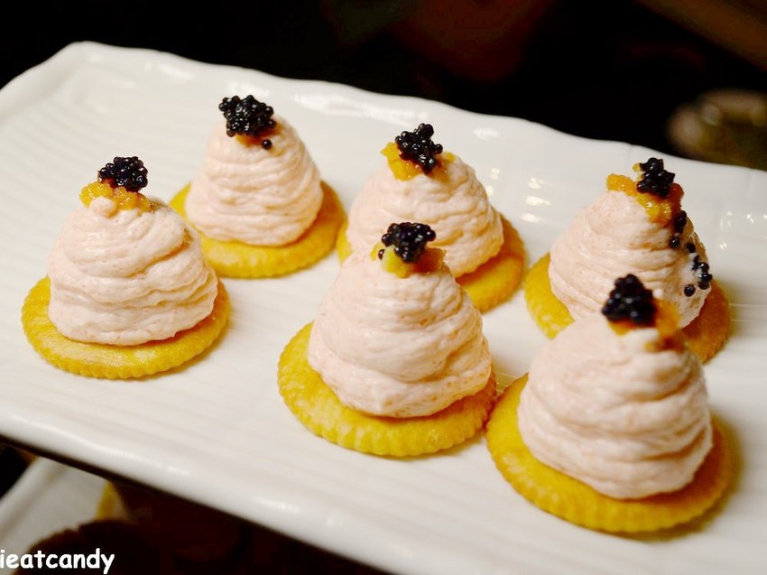 俄羅斯海膽魚子醬小點內含有調製的酸奶明太子醬,帶點微辣的口感,佐以魚子醬及海膽這種奢華的鮮味,真的很適合一口酒、一口小點,尤其我超愛明太子的,整個吃下都沒問題啊~