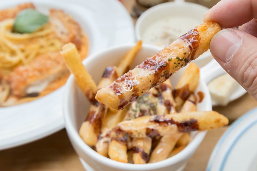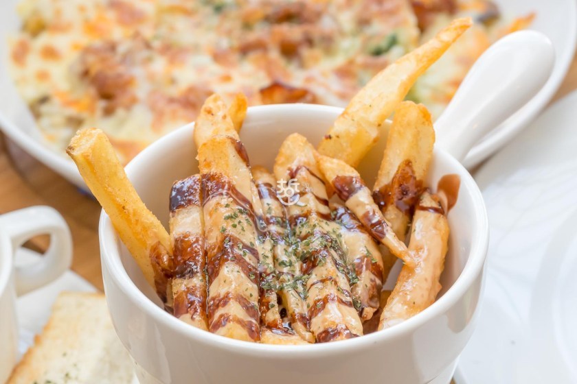 剛起鍋的薯條,淋一層花生醬與一層巧克力醬,女生看到會高興得不要不要,吃起來還蠻對味,口味有中。