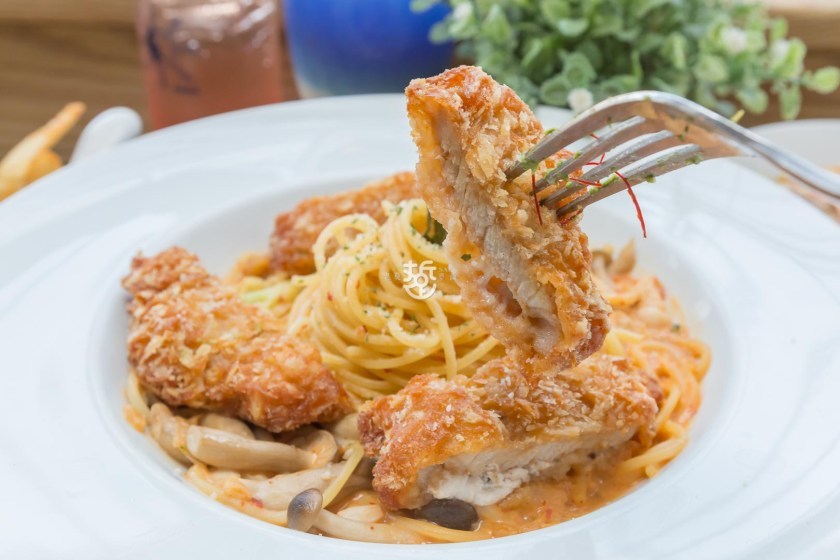 這盤麵,我笑稱為三國麵^^。用韓式泡菜再加牛奶下去做成義式風味的口感,上頭的日式炸豬排,肉切得很厚、外皮酥脆,而裡頭的肉質吃起來很軟。