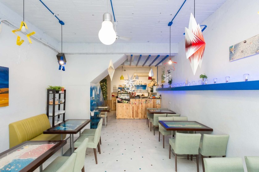 走進伊甸風味館,是明亮顯眼的藍白配色,一樓前方是座位區,吧檯以及廚房位在店的後方。
