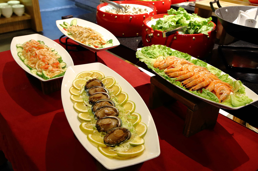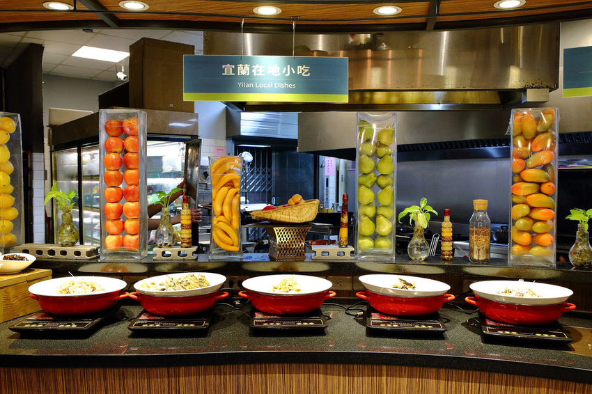 海鮮冷盤、宜蘭在地小吃、現燙青菜、現煮麵區、水果區、甜點區等等,